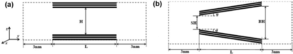 狹縫孔由半有限狹縫孔由兩個(gè)平行的石墨壁組成。每個(gè)壁包含三個(gè)石墨烯層,如圖1(a)所示?虻奶摼表示模擬框在y和z方向上的邊界。周期性邊界條件僅適用于x方向。兩個(gè)開口端與大塊氣藏相連,每個(gè)氣藏沿y軸的長(zhǎng)度為3nm,孔隙寬度決定了z方向的尺寸。因此,通過(guò)孔內(nèi)分子與體相的相互作用,可以在孔和周圍環(huán)境之間保持機(jī)械平衡?讖紿是指通過(guò)一個(gè)壁最內(nèi)層中碳原子中心的平面與相對(duì)壁的相應(yīng)平面之間的距離。楔形孔在圖1(b)描繪了一個(gè)開放的楔形孔及其結(jié)構(gòu)參數(shù):小端(SH)和大端(BH)的孔徑,軸向孔長(zhǎng)(L)和半角(α)?虻奶摼表示模擬框在y和z方向上的邊界。與狹縫孔一樣,開口端周圍的氣體沿y軸的長(zhǎng)度為3nm,大端的寬度決定了z方向的尺寸。沿軸向(即,y方向)的孔長(zhǎng)度是有限的L,而在x方向上的尺寸在應(yīng)用周期性邊界條件的情況下假定為無(wú)限。