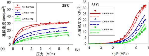 圖2:純氣體N2、CH4和CO2在T=25℃時(shí)在活性炭上的實(shí)驗(yàn)數(shù)據(jù)。用狹縫和楔形孔中的吸附等溫線預(yù)測(cè)數(shù)據(jù):(a)絕對(duì)壓力和(b)對(duì)數(shù)標(biāo)度的絕對(duì)壓力。