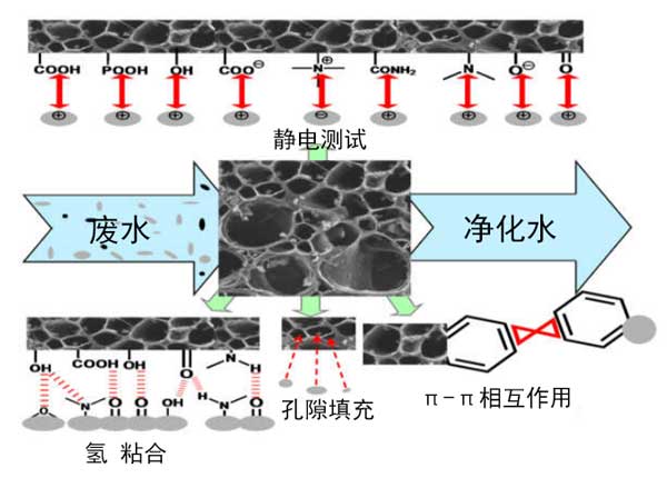 應(yīng)該注意的是,對活化過程的理解是優(yōu)化活性炭制備的基本步驟。實際上,各種化學(xué),物理和物理化學(xué)方法被用于從不同的天然或合成資源合成活性炭;瘜W(xué)處理涉及通過浸漬然后熱解使用活化劑,而物理過程涉及在蒸氣或二氧化碳存在下的高溫?zé)崽幚。但是,這兩種方法的組合也已用于生產(chǎn)活性炭。根據(jù)所采用的處理方法,很難預(yù)測碳的物理化學(xué)和形態(tài)特性。看來形態(tài),物理化學(xué),質(zhì)地,通過改變活化時間和溫度以及所用前體的性質(zhì),活性炭的表面性質(zhì)會發(fā)生顯著變化。活性炭表面的化學(xué)性質(zhì)取決于存在于表面上的雜原子的類型,例如氧,氮,硫等。這些積累在表面上的雜原子或基團要么來自原材料本身,要么在活化過程中被引入。這在很大程度上與前體的性質(zhì)有關(guān)。所有這些特性對于使用碳作為水溶液中污染物的吸附劑具有重要意義。實際上,污染物在活性炭上的吸附是一個復(fù)雜的過程,在涉及物理作用和/或化學(xué)鍵的過程中,各種相互作用可以共存。從而,可能發(fā)生的吸附機理為靜電相互作用,氫鍵,π-π堆積相互作用,孔填充,疏水相互作用,離子交換以及其他相互作用(n-π相互作用等)和絡(luò)合反應(yīng)。圖2說明了在活性炭上吸附污染物的主要相互作用方法。