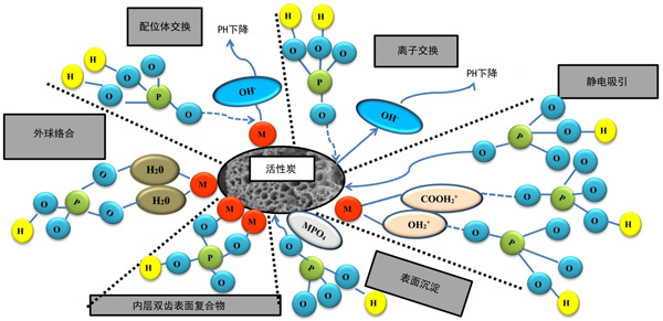 通常,磷的吸附過程是活性炭中的吸熱反應。等溫線包括Freundlich,Langmuir和Langmuir-Freundlich能夠預測廢水中活性炭對磷的吸附。在這些條件下,Langmuir通常更適合實驗數(shù)據(jù)。圖2總結了磷在活性炭表面上吸附的各種機理。一些機制以高親和力和強度(例如,配體交換和內(nèi)球雙齒)將磷固定在其表面上,而另一些機制以較低的強度(例如,外球絡合和靜電吸引)固定在磷表面,從而降低了除磷效率。