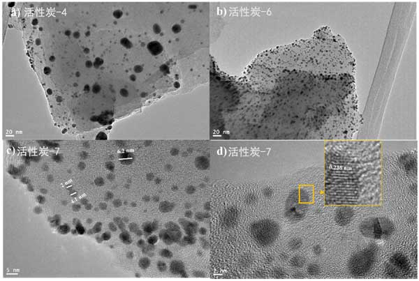 為了進(jìn)一步研究金顆粒在活性炭表面的分布和結(jié)晶度,我們拍攝了鍍金活性炭樣品的透射電子顯微鏡圖像。圖7顯示了各種活性炭樣品在不同放大倍數(shù)下的TEM圖像。圖2a、b顯示了金納米粒子在活性炭表面上的分布。很明顯,兩個(gè)樣本的分布是均勻的;钚蕴-4和活性炭-6似乎都以類似的方式相互作用和承載金納米粒子;钚蕴-7樣品的高分辨率TEM圖像如圖2c、d所示。圖2c顯示大多數(shù)金納米顆粒很小,直徑為3-5nm,并且只能看到少數(shù)團(tuán)聚顆粒。圖2d顯示了金的晶格條紋間距。發(fā)現(xiàn)晶格條紋間距為0.217nm,對(duì)應(yīng)于金晶面的面。此外,我們?cè)噲D通過(guò)TEM圖像估計(jì)顆粒尺寸的分布,我們發(fā)現(xiàn)所有樣品中超過(guò)80%的金顆粒的尺寸小于5nm。