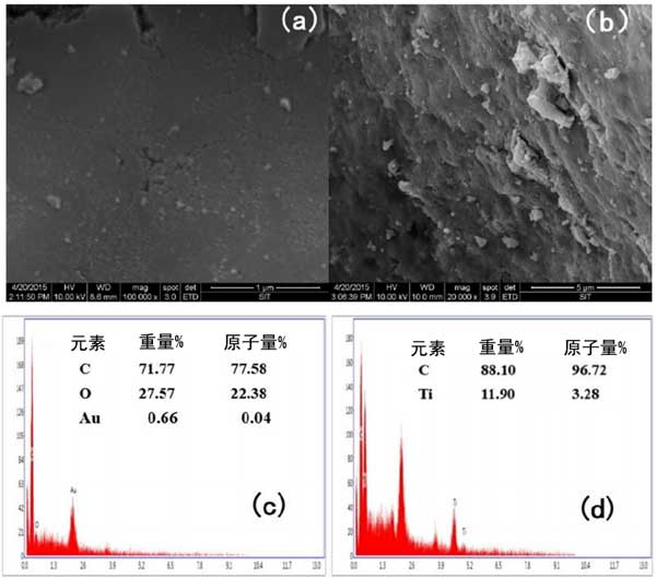 活性炭載二氧化鈦是通過溶膠-凝膠法合成的。在室溫下,將待載溶解在無水乙醇中,然后將冰醋酸緩慢加入漿液中。用濃鹽酸將溶液的pH值調(diào)至2-3。隨后,懸浮液在室溫下攪拌30分鐘并超聲10分鐘得到改性活性炭。SEM圖像及其對活性炭和載二氧化鈦活性炭的EDX分析如圖1所示?梢郧宄乜吹交钚蕴烤哂胁灰(guī)則的多孔結(jié)構,分布密度高。EDX上的元素映射表明C、O和Au的百分比分別為77.77%、27.57%和0.66%。應該注意的是,Au主要來自用于增強導電性的鍍金膜。發(fā)現(xiàn)二氧化鈦顆粒分散在活性炭的表面。此外,在載二氧化鈦的活性炭上可觀察到粗糙的多孔結(jié)構,證實了二氧化鈦在活性炭表面形成。