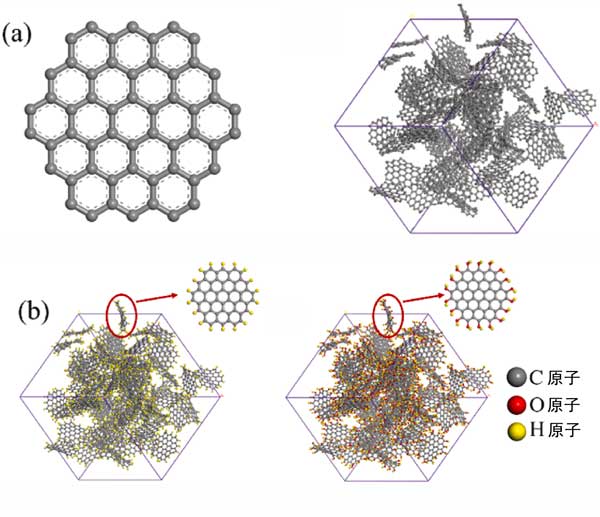 圖1:(a)顯示了基本活性炭的結(jié)構(gòu)和微孔活性炭模型,(b)具有不同官能團的微孔活性炭(a)–H;(b)–OH。