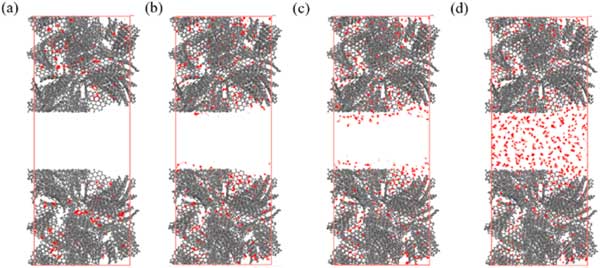 活性炭由微孔和介孔組成,介孔在一定程度上影響吸附特性。因此,研究芳烴在具有分級孔的活性炭上的吸附特性,以明確介孔對下一節(jié)吸附特性的影響。在這些模擬中,選擇了密度為0.8g/cm3的微孔活性炭,不同樣品的中孔尺寸分別選擇為2.0、2.5、3.0和4.0nm。具有不同層次孔隙的活性炭。分層孔隙活性炭模型構(gòu)建為密度在0.6-0.7g/cm3的合理范圍內(nèi)。圖3展示了苯分子在p=10kPa下具有不同中尺度孔徑的活性炭上的吸附位點分布。這表明即使在p=10kPa時,苯的吸附也僅發(fā)生在介孔表面,而不會填充介孔的空隙空間。圖4說明了對二甲苯在具有3.0nm孔的活性炭上從低壓到高壓的吸附位點的變化。從圖4(a)-(d)可以看出,只有微量的對二甲苯分子被吸附到微孔上,當(dāng)壓力為1.25kPa時,微孔逐漸被填滿,中孔壁上出現(xiàn)吸附位點。當(dāng)壓力增加到3.75kPa時,吸附位點增加,介孔中開始出現(xiàn)多層吸附,最終介孔充滿對二甲苯,此時壓力可達(dá)6.25kPa。