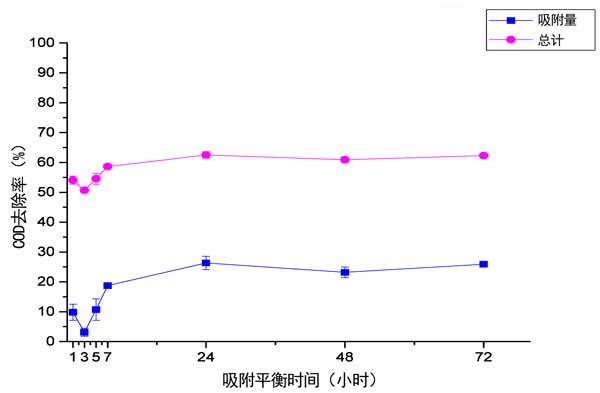 吸附過程應(yīng)用于芬頓氧化的出水樣品。在1、3、5、7、24、48和72小時收集樣品,通過在pH=7.5、25℃和170rpm攪拌速率下加入1g活性炭來確定平衡時間(圖1)。對于吸附在1和5小時之間的平衡時間,COD去除效率在3.1±1.3%和10.7±3.6%之間波動。隨著平衡時間從5小時增加到24小時,COD去除效率從10.7±3.7%和54.5±1.8%分別顯著增加到26.3±2.2%和62.5±1.1%(吸附和總量),對應(yīng)COD濃度從500.0±28.3降低到410±18mg。由于在活性炭的外表面上形成了有機(jī)材料的單層覆蓋層,COD去除增加直到達(dá)到平衡時間。平衡時間的進(jìn)一步增加沒有顯示出任何統(tǒng)計學(xué)差異(p>0.05);因此24小時被用作進(jìn)一步實驗的平衡時間。