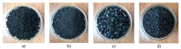 圖2:作為過(guò)濾介質(zhì)的吸附劑,a-果殼活性炭,b-煤質(zhì)活性炭,c-木質(zhì)活性炭,d-椰殼活性炭。