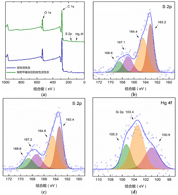 圖3:甲基汞吸附前后活性炭硫醇改性材料的XPS光譜,(a)活性炭(b)在甲基汞吸附之前和(c)之后的高分辨率S2p核心能級(jí)光譜,(d)以及在甲基汞吸附之后活性炭的Hg4f核心能級(jí)光譜。