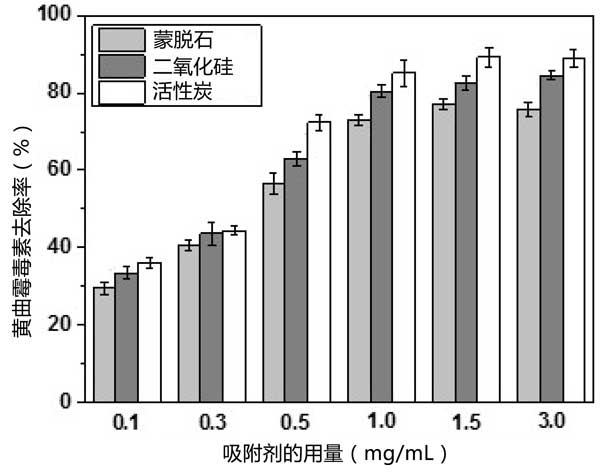 三種吸附劑對(duì)AFB1的吸附在25℃下進(jìn)行24小時(shí)。圖1顯示了活性炭和其它吸附劑用量的AFB1去除率。無論吸附劑劑量如何,使用活性炭時(shí)去除率更高,其次是二氧化硅和天然蒙脫石。正如預(yù)期的那樣,AFB1的去除率隨著吸附劑劑量的增加而增加,這可以通過AFB1與吸附劑之間的相互作用增加來解釋,包括氫鍵、孔填充和靜電吸引力。吸附劑量為1.0mg/mL時(shí),黃曲霉毒素的去除率使用蒙脫石、二氧化硅和活性炭時(shí),分別為73.23%、80.35%和85.09%。在較高的吸附劑量(1.5mg/mL)下,去除率分別略微增加至75.56%、83.48%和89.15%。在這個(gè)吸附系統(tǒng)中,當(dāng)吸附劑以較低濃度使用時(shí),可用的吸附位點(diǎn)較少。因此,增加吸附劑濃度有效地增加了吸附位點(diǎn)的數(shù)量,從而提高了AFB1的去除率。但濃度過高時(shí),吸附劑顆粒間會(huì)發(fā)生膠結(jié)、絮凝和團(tuán)聚現(xiàn)象。這導(dǎo)致可用吸附位點(diǎn)的數(shù)量穩(wěn)定或減少,并且去除率沒有進(jìn)一步提高。此外,當(dāng)吸收劑以高濃度使用時(shí),可能會(huì)消除維生素E和甾醇等微量營(yíng)養(yǎng)素,從而導(dǎo)致營(yíng)養(yǎng)流失。因此,使用濃度為1.0mg/mL的吸附劑被認(rèn)為是合適的,因此在進(jìn)一步的實(shí)驗(yàn)中被采用。