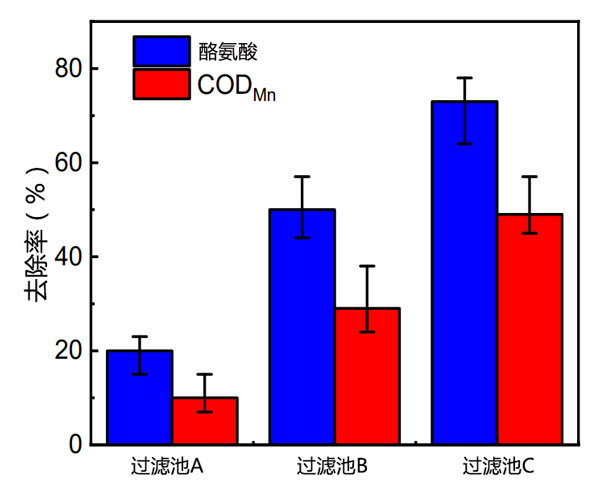 活性炭濾池出水二氯乙腈前體酪氨酸和CODMn的平均去除率如圖2所示。實驗過程中,三個活性炭過濾器出水酪氨酸濃度依次下降:過濾器C(73%)>過濾器B(50%)>過濾器A(20%)(p<0.05)。生物濾池出水的酪氨酸濃度低于進水。誰記錄了飲用水處理廠生物過濾后出水中DON濃度的增加,表明DON總體出水濃度的變化并不代表個體的變化,而是過濾器中不同個體的變化規(guī)律也不同。平均出水CODMn去除率的變化趨勢與平均出水酪氨酸去除率一致。CODMn去除率可以反映生物濾池中有機物的去除情況。酪氨酸是一種有機物,其分子結構中含有還原性酚羥基和氨基,可被高錳酸鉀氧化。因此,CODMn去除率也可以作為酪氨酸去除的依據。