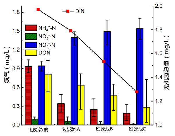 飲用原水中的氮主要以NH4+-N、NO2-N、NO3N和有機氮的形式存在。本實驗中的大部分有機氮是酪氨酸。在生物濾池中,溶解無機氮(DIN)和DON是相互轉化的,因此有必要討論活性炭濾池中向氮的轉化。進出活性炭濾池的水中氮的變化如圖3所示。溶解無機氮損失為活性炭濾池C>B>A(p<0.05),與CODMn的去除率一致。過濾器對有機物的利用隨著溶解無機氮損失的增加而增加,表明反應中的溶解無機氮損失現象與過濾器反硝化有關。