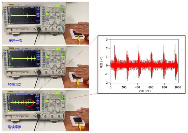圖4:在單電極配置下使用手指輕敲和生成的電壓信號(hào)的插圖演示了活性炭制造的發(fā)電機(jī)運(yùn)動(dòng)傳感應(yīng)用。