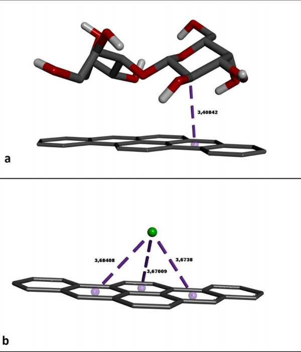 在這項研究中,進行了分子對接以檢查活性炭與乳糖以及離子:鈣的原子間相互作用。如圖2a所示,乳糖分子在其結構中的吡喃半乳糖環(huán)的第三個碳原子上與活性碳的六角碳環(huán)形成一個疏水π-σ接觸。雖然這種非鍵合接觸的長度為3.40Å,但乳糖與活性炭的結合自由能是有利的。鈣(Ca+2)離子與三個相鄰的活性炭六角碳環(huán)形成三個鍵相互作用(圖2b)。