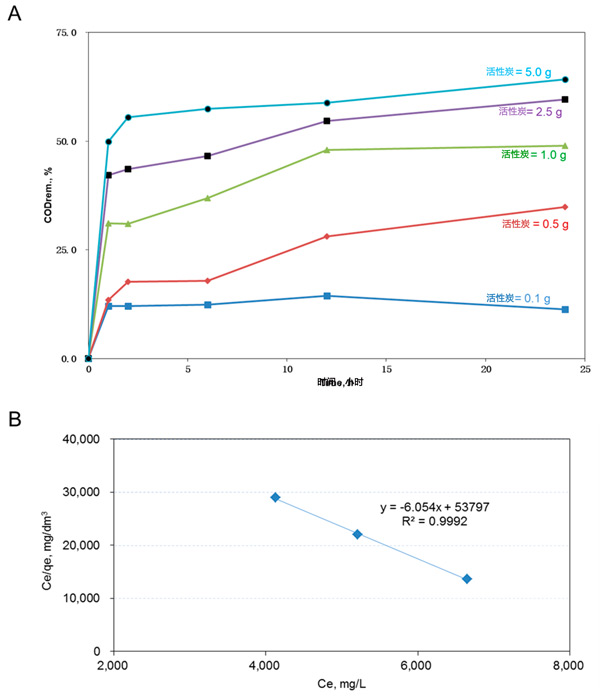 圖1:使用過(guò)的活性炭的吸附特性。(A)去除的COD百分比與用于吸附染色廢水COD的活性炭量的關(guān)系圖。(B)Ce/qe比率與Ce的關(guān)系圖。