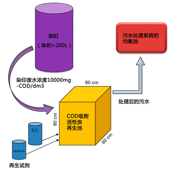 根據(jù)獲得的數(shù)據(jù)和當(dāng)前的紗線染色工藝,使用所提出的兩步處理系統(tǒng)處理來(lái)自常用的200L染浴的高COD染色廢水看起來(lái)適用,并提出了建議如圖3所示。據(jù)我們所知,目前運(yùn)營(yíng)的染色設(shè)施中沒有這種建議的設(shè)置。設(shè)計(jì)容積(即200L)足以容納一批染缸出水,使高COD廢水可直接進(jìn)入擬建裝置的吸附和再生。根據(jù)結(jié)果,去除50-60%的COD將大大減少回流到平衡罐的COD,從而避免現(xiàn)有廠內(nèi)生物處理單元的過(guò)載情況。為了運(yùn)行所提議的裝置,首先,將來(lái)自染色池的一定量的高COD廢水引導(dǎo)至充滿指定活性炭的反應(yīng)單元(如果處理120L廢水,則為20kg)進(jìn)行24小時(shí)吸附。由于結(jié)果表明染浴出水COD在酸性pH值下吸附更多,二是對(duì)處理后的廢水進(jìn)行篩分,24小時(shí)后排至其廢水處理設(shè)施的頭部(即平衡池)。第三,分別串聯(lián)添加初始濃度為2.12mmol/dm3和2.5%的乙二胺四乙酸鐵鈉和過(guò)氧化氫,以啟動(dòng)活性炭再生1小時(shí)。從連續(xù)運(yùn)行來(lái)看,兩步法處理高COD染色廢水的應(yīng)用前景看好。然而,我們確實(shí)注意到該技術(shù)的當(dāng)前應(yīng)用可能僅限于染浴設(shè)計(jì)及其操作。染浴的高COD流出物發(fā)生在染色過(guò)程的第一次排放,但對(duì)于大多數(shù)可用的染浴操作,根據(jù)不同的COD濃度對(duì)每批流出物進(jìn)行分離是不適用的。一些染色裝置或染色工藝的改造被認(rèn)為是必要的。