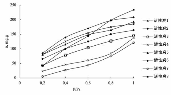 來自植物廢料的活性炭中,活性炭的K值表示吸附劑的吸收能力的最高值,活性炭2的最佳值是由于微孔體積大。表征煤與丁醇相互作用的能量的模型參數(shù)n是活性炭的最小參數(shù)。這對應于最凸的吸附等溫線(圖2),這有利于捕獲低濃度的丁醇蒸氣。就活性炭3而言,除活性炭4外,所有活性炭均優(yōu)于活性炭5,與活性炭2相當。根據(jù)極限飽和值,由圖1和圖2中的動力學曲線證明。如圖1所示,繪制了相應的吸附等溫線(圖2)。