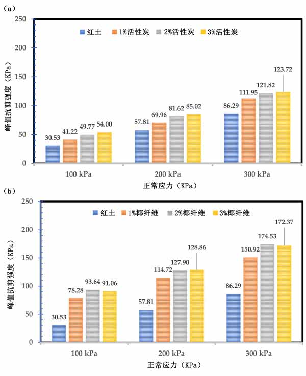 活性炭試樣的剪切強(qiáng)度與剪切應(yīng)變的關(guān)系。峰值剪切強(qiáng)度隨著正應(yīng)力的增加而提高,特別是300kPa正應(yīng)力。此外,添加活性炭增加了峰值剪切強(qiáng)度,并且增強(qiáng)率隨著法向應(yīng)力的增加而增加,如圖4a所示。同樣,添加0.5%的椰殼纖維進(jìn)一步提高了活性炭穩(wěn)定土的峰值剪切強(qiáng)度,如圖4b所示。雖然在天然紅土中添加活性炭會(huì)增加峰值強(qiáng)度,但對(duì)于超過2%的活性炭,增加率并不顯著。例如,活性炭穩(wěn)定土的峰值強(qiáng)度分別為2%和3%活性炭的121.8kPa和123.72kPa。總體而言,與本研究的結(jié)果相似。發(fā)現(xiàn)在石灰穩(wěn)定土壤中使用椰殼纖維可進(jìn)一步提高抗拉強(qiáng)度和抗壓強(qiáng)度。還觀察到,椰殼纖維的加入提高了膨脹土中的兩個(gè)剪切參數(shù)。