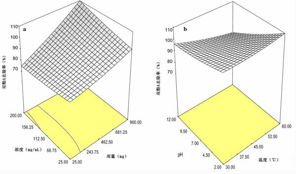 圖2:活性炭上雙酚A去除效率的響應(yīng)面3-D圖顯示了(a)初始濃度和劑量以及(b)pH和溫度的影響。