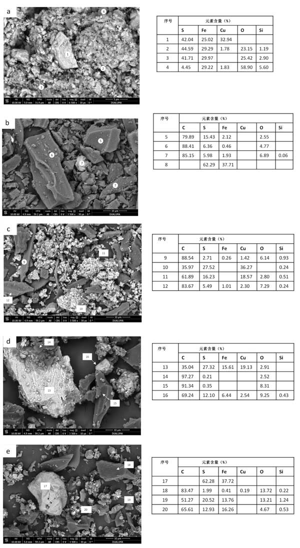 最終殘留物的SEM-EDS圖像在圖2顯示,并證實了通過XRD獲得的結(jié)果。圖2a顯示了礦物浸出后固體殘渣的SEM圖像?梢杂^察到大的黃銅礦顆粒的存在(點1),黃鐵礦的小顆粒具有不同的氧化礦物(點2、3和4)。樣品活性炭浸出后的固體殘留物圖像(圖2b)顯示活性炭的存在,其表面具有硫原子和一些Fe(點5、6和7)和黃鐵礦(點8)。沒有觀察到銅的存在,這與其高提取值(99.1%)一致。圖2c顯示了樣品活性炭1:0.25浸出后獲得的固體殘留物的圖像。在活性炭的表面上可以觀察到硫和銅的存在,可能是由于CuS(點9-12)。用生物炭浸出礦物后的固體殘渣分析見圖2d(比例1:1)和(比例1:0.25)。根據(jù)XRD分析,有黃銅礦顆粒(點13)類似于沒有生物炭的礦物浸出的固體殘渣。與添加活性炭相比,生物炭顆粒的表面硫含量較低(點14和15),表明生物炭吸附能力較低,這與生物炭的較低表面積一致。生物炭表面上存在的一些硫可能是由于與浸出劑的反應(yīng)和硫物質(zhì)的低吸附性。最后,觀察到不同礦物的聚集體(第16點)。關(guān)于生物炭比例為1:0.25的固體殘留物,黃鐵礦的存在(第17點),生物炭與少量S、Cu和Fe結(jié)合(第18點),可以觀察到不同礦物和碳顆粒的小顆粒混合物(第19點和第20點)。