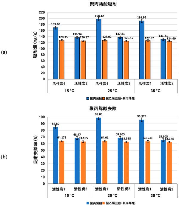 圖1:聚丙烯酸吸附量(a)及其從活性炭表面去除的百分比(b)在單一和混合吸附物系統(tǒng)中,在三個(gè)檢測(cè)溫度pH值3下。