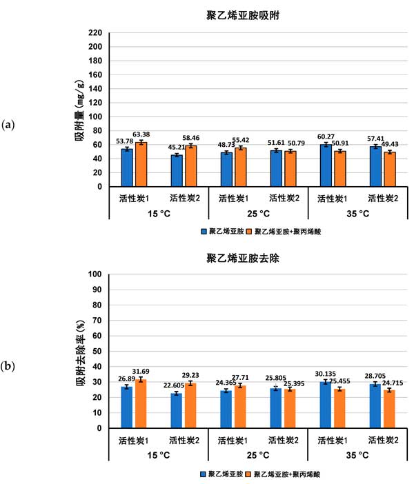 圖2:聚乙烯亞胺吸附量(a)及其從活性炭表面去除的百分比(b)在單一和混合吸附物系統(tǒng)中,在三個(gè)檢測(cè)溫度pH3下。