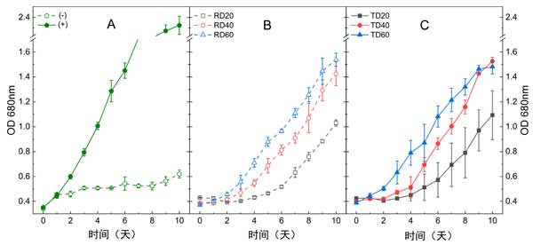 厭氧消化物中存在的大量和微量營(yíng)養(yǎng)素的多樣性可能有利于藍(lán)藻代謝。即使活性炭預(yù)處理顯著降低了幾個(gè)參數(shù),包括COD、濁度和苯酚含量,原料(4405mg/L)和預(yù)處理消化物(4220mg/L)的銨濃度仍然高于藍(lán)藻螺旋藻支持的閾值濃度(100–150毫克/升)。在這種情況下,使用以三種不同稀釋率稀釋的原始和預(yù)處理消化物進(jìn)行了一系列藍(lán)藻毒性測(cè)定:20×、40×和60×。未稀釋的消化物,無(wú)論是否用活性炭處理,都沒(méi)有在本實(shí)驗(yàn)中進(jìn)行測(cè)試,因?yàn)槌醪脚囵B(yǎng)分析表明它們對(duì)培養(yǎng)物毒性太大(數(shù)據(jù)未顯示)。因此,該實(shí)驗(yàn)的目的是比較以不同稀釋率稀釋的兩種消化物以及兩個(gè)對(duì)照組之間的生長(zhǎng)性能。連續(xù)測(cè)量680nm處的OD超過(guò)10天,以評(píng)估所有條件下的生長(zhǎng)情況。在三種不同稀釋因子下測(cè)試的原始消化物(RD)和處理過(guò)的消化物(TD)條件下,觀察到類(lèi)似生長(zhǎng)趨勢(shì)(圖2A、B)。當(dāng)增加原始和預(yù)處理消化物的培養(yǎng)基稀釋倍數(shù)時(shí),會(huì)產(chǎn)生更高的生長(zhǎng)反應(yīng)。同樣,滯后期受原始消化物和預(yù)處理消化物的稀釋因子的影響,觀察到的滯后期越長(zhǎng),消化物越濃縮。例如,稀釋20倍和40倍的未處理消化物的滯后期分別持續(xù)4天和2天。在本研究中,根據(jù)稀釋倍數(shù)和預(yù)處理?xiàng)l件,使用221和71mg/L之間的初始銨氮(NH4+-N)濃度,鈍頂藻能夠增殖。一般而言,原始消化物和預(yù)處理消化物的更高稀釋度產(chǎn)生更高的生長(zhǎng)。
