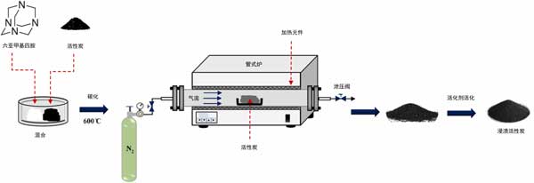 將一定量的無煙煤作為活性炭源添加到六亞甲基四胺中,然后充分混合。接下來,將所得產(chǎn)品置于連續(xù)N2流下的管式爐中(示意圖1)。然后我們用KOH作為化學(xué)活化劑以3/1的比例對所得產(chǎn)物進行化學(xué)活化。接下來,所得產(chǎn)品在溫度為120℃的烘箱中干燥24小時。為了去除雜質(zhì)和未反應(yīng)的化學(xué)試劑,我們用HCl溶液(3M)洗滌樣品6小時,然后用去離子水中和所得產(chǎn)物。隨著原材料和浸漬物的用量(比例4/1)的變化,我們合成了幾個樣品,并將它們表示為浸漬活性炭A-D。為了進一步研究,我們還用了普通活性炭來進行實驗對照。