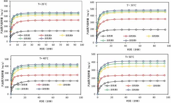 經(jīng)過進一步研究,發(fā)現(xiàn)活性炭D樣品比其他樣品更能增強汽油蒸汽吸附,這表明表面結(jié)構(gòu)在捕獲分子方面的重要性和關(guān)鍵作用,正如預(yù)期的增強吸附一樣。事實上,與其他合成樣品相比,活性炭樣品具有更高的表面積和豐富的微介孔,可以顯著提高吸附量圖2。我們還研究了活性炭用量對吸附容量的影響。正如發(fā)現(xiàn)的那樣,隨著活性炭的用量增加,蒸汽吸附能力可以進一步提高,這可能是由于通過提高活性炭量,表面積和孔隙反而增加,進而可能有助于增強吸附。鑒于發(fā)現(xiàn)隨著活性炭用量比從1增加到4,汽油蒸氣吸附能力提高。