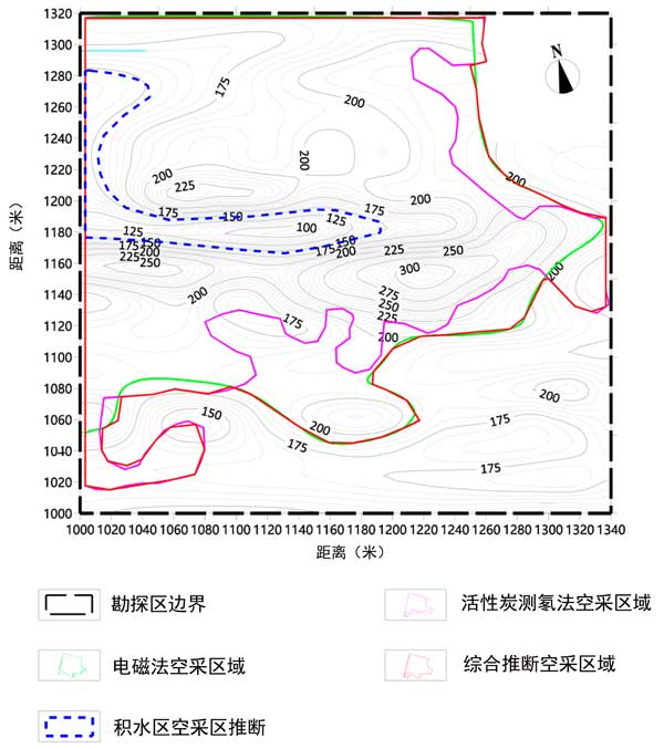 本次調(diào)查工作將電磁法與活性炭測(cè)氡法相結(jié)合,形成綜合物探方法,對(duì)某礦區(qū)地下采空區(qū)情況進(jìn)行了研究。首先,電磁法用于探測(cè)采空區(qū)的深度探測(cè)。發(fā)現(xiàn)1個(gè)低阻異常帶和1個(gè)高阻異常帶,推測(cè)后者為采空區(qū)異常帶,前者由采空區(qū)積水或大鵬地層水富集形成,推測(cè)為采空區(qū)積水異常帶。然后使用用于測(cè)氡的活性炭方法來推斷地下采空區(qū)的位置和范圍。結(jié)合電磁法勘探成果,推測(cè)該采空區(qū)為氡值異常帶。