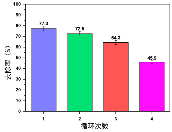 通過回收研究調(diào)查了改性活性炭的再利用以從廢水中去除活性黑5。進行實驗時,最初使用100mg/L活性黑5和0.8g/L的改性活性炭,pH值為2。在第一個循環(huán)之后,使用0.01M/NaOH溶液對所使用的改性活性炭顆粒進行處理大約2小時。此后,用蒸餾水沖洗顆粒以除去任何殘留的堿。選擇被認為可接受的重復時間,以便能夠在后續(xù)循環(huán)中重復使用吸附劑。研究結(jié)果如圖3所示。在用1M/NaOH處理成功再生后,解吸的改性活性炭能夠重復使用多達四個循環(huán)以去除活性黑5。活性黑5的去除百分比在第一個循環(huán)中約為77.3%,在第四個循環(huán)后下降至約45.9%。總的來說,這項研究證明了將改性活性炭吸附劑重復使用四個循環(huán)以從廢水中去除活性黑5的潛力。
