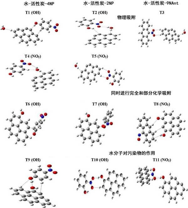 活性炭硝基有機(jī)污染物吸附中水的作用,在干燥和潮濕條件下氣相活性炭上4NP、2NP和9NAnt分子的吸附進(jìn)行了分子水平的系統(tǒng)研究。密度泛函理論計(jì)算表明不同物質(zhì)在活性炭上部不飽和側(cè)具有良好的吸附作用。濕度可以刺激吸附。水可以充當(dāng)主體和吸附物之間的連接劑,但可以產(chǎn)生競(jìng)爭(zhēng),因?yàn)榭紤]到其極性行為,它可以直接連接到活性炭的非極性表面。