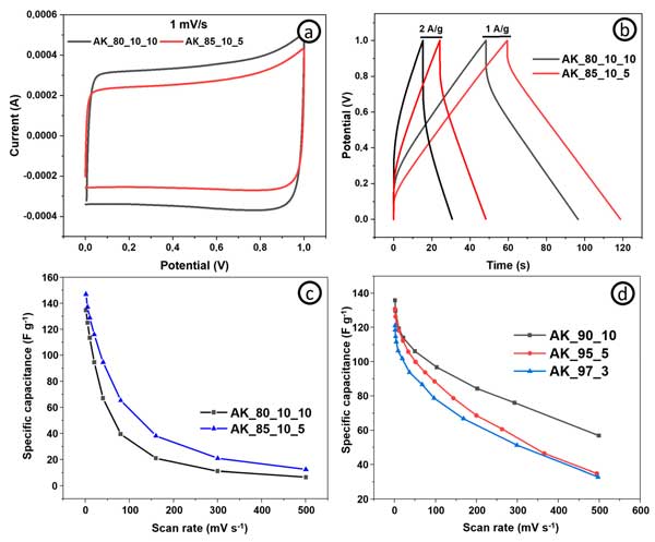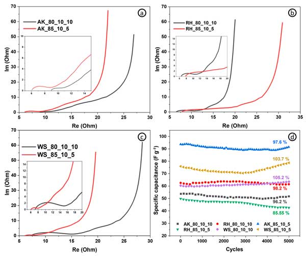活性炭電極表現(xiàn)出比常規(guī)樣品更好的比電容和能量密度(相同功率密度下的最大能量密度為4.8vs.4.4Wh/kg-1),因為有更多的活性材料,而電阻、倍率能力(圖3c)和功率密度—這取決于電極的導(dǎo)電能力(基于導(dǎo)電添加劑含量)。圖3d顯示了具有不同活性炭和碳納米管含量的電極在不同掃描速率下的比電容。碳納米管含量為10%的電極在1mV/s-1下實現(xiàn)了137F/g-1的最高比電容。從圖中可以清楚地看出,就比電容而言,活性炭和碳納米管的最佳比例為90:10。綜上所述,我們可以得出這樣的結(jié)論:對于超級電容器的自支撐電極,活性成分、結(jié)合成分和導(dǎo)電成分的最佳比例為85:10:5?梢赃M一步評估具有這種含有源自其他生物前體的活性材料的組合物的電極的電化學(xué)性能。