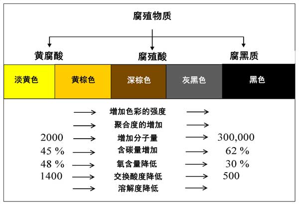 腐殖質的性質與其成分有非常密切的聯(lián)系,其成分受到腐殖化過程的影響,與分子(分子量)和顆粒的大小、分散程度(真溶液或膠體溶液)、極性(由這些決定)由骨架的性質(芳香族;脂肪族)決定,主要是官能團的類型、數(shù)量和解離能力。腐殖質成分的功能在于其在水中的溶解度(黃腐酸的溶解度比腐植酸高,因此天然水中平均含有87%的黃腐酸)、聚集能力、解離能力(主要是羧基)官能團)和相關的電荷比(粒子的zeta電位)。腐殖質的一些特性也受到水的成分及其pH值的影響。圖1顯示了腐殖質的基本特性。