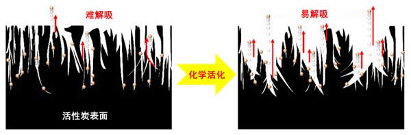 活性炭表面微孔體積與外部孔體積之比越高,解吸反應(yīng)就越困難,因為已吸附的氣體必須通過復(fù)雜而長的通道釋放。相反,較低對應(yīng)于表面上較大體積的大直徑孔。即使吸附物被深深地吸附到活性炭表面,解吸反應(yīng)也可以沿著寬闊而簡單的通道輕松快速地進(jìn)行。也就是說,活性炭表面的比率越高,解吸反應(yīng)受到的抑制程度就越大,從而導(dǎo)致吸附容量越高。