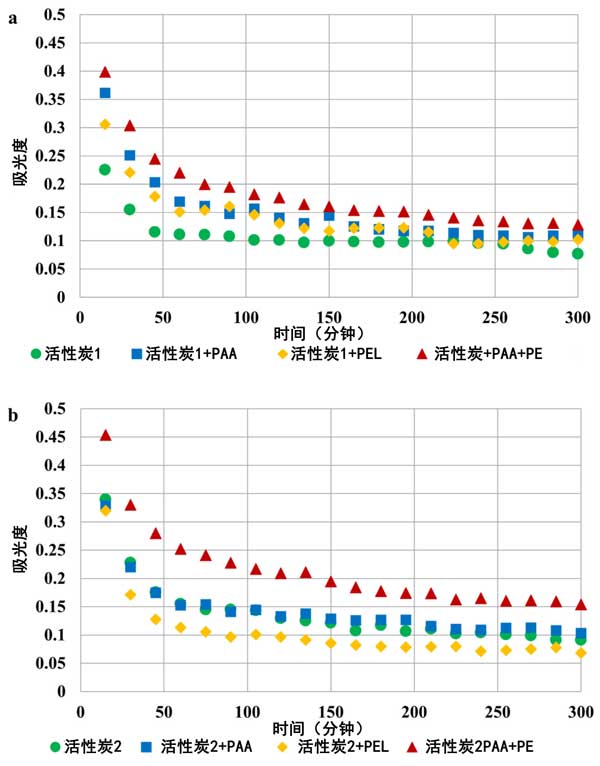 圖4:單吸附質(zhì)和二元吸附質(zhì)系統(tǒng)中活性炭1(a)和活性炭2(b)活性炭懸浮液在pH3時(shí)的穩(wěn)定性。