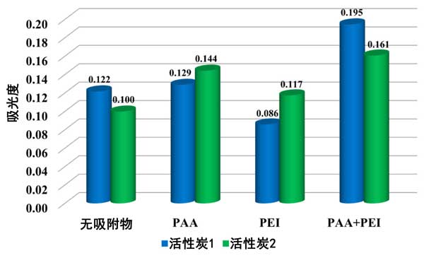 圖5:單一和二元吸附質(zhì)系統(tǒng)中活性炭1和活性炭2懸浮液在pH3時(shí)150分鐘后的吸光度。