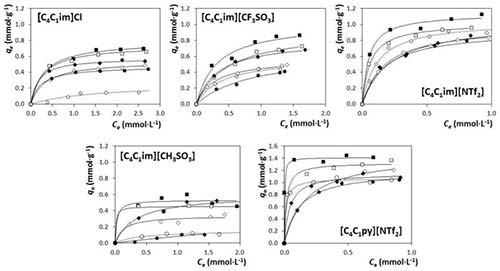 得到的結(jié)果表明,活性炭的不同的吸附能力與IL的性質(zhì)和溶液中的鹽量有關。一般而言,對于咪唑鎓的ILs,陰離子對其對活性炭的吸附能力的影響按照以下順序:Cl - ≈[CH 3 SO] <[CF 3 SO 3 ] -<[NTf 2 ] 。這一趨勢的結(jié)果和預計的相符合,并且表明,隨著陰離子疏水性的增加,活性炭對ILs的吸附逐漸增加。另一方面,考慮到IL陽離子家族,活性炭能吸附更多的吡啶鎓比基于咪唑類的對應物?傊,這里證明,如果伴隨使用無機鹽來促進鹽析現(xiàn)象并增強隔離度,則活性炭也可以用作水介質(zhì)中低濃度存在的親水性IL的有效吸附劑。得到的結(jié)果表明, 在鹽的存在下,親水性ILs的例如[C 4 C 1 im] Cl和[C 4 C 1 im] [CH 3 SO3 ]的K d值增加高達5.5倍。這種新方法可以被設想為減少由使用IL的工業(yè)過程產(chǎn)生的含水物流污染的有希望的途徑。
