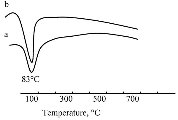 利用DTA技術研究了煅燒過程中催化劑的性質變化。圖1顯示了煅燒和干燥活性炭載體的DTA曲線。兩個樣品在83℃附近只有一個吸熱峰。該峰對吸附水的解吸有貢獻。考慮到活性炭是具有極高容量和高吸附速率的優(yōu)異吸附劑的事實,甚至在樣品干燥或煅燒之后峰值出現也就不足為奇了。兩種樣品的DTA曲線沒有明顯差異,表明煅燒對載體的熱性質基本上沒有影響。