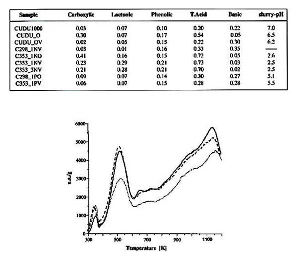 圖1顯示了過氧化氫處理后產(chǎn)生的活性炭的化學(xué)行為。從上面看出的氧化過程增加了活性炭的總酸度,并且與羧基和酚類基團(tuán)的增加一致。此外,TPD曲線顯示了放出氣體的增量,峰值集中在與活性炭相同的溫度。低溫和高溫分解組的面積總體增加歸因于羧基-內(nèi)酯類結(jié)構(gòu)和后面的酚類基團(tuán)。H2O2氧化碳的FT-IR光譜在1542和1190cm-1處顯示帶就像那些原始的碳,但后來的孔隙已經(jīng)擴(kuò)大,顯示出C-O伸展模式的增加?傊@些研究表明僅在H的性質(zhì)的小變化H2O2處理過的碳,即,是在氧化時,其類似于由其他研究人員報告的行為沒有觀察到變化顯著。其中過氧化氫溶液的氧化作用明顯地看作羧酸類基團(tuán)的重要減少,伴隨著堿性基團(tuán)的大量增加。