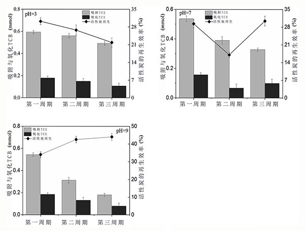 pH的變化導致活性炭表面電荷的變化并影響吸附性能。如在呈現(xiàn)圖1,吸附/再生循環(huán),不同的pH條件下進行三次。圖1的左Y軸表示在吸附/再生循環(huán)期間吸附或氧化的TCE量,圖1的右Y軸表示吸附/再生循環(huán)期間TCE的再生效率。在再生期間TCE最終被氧化成氯化物(1mol TCE最終可以產(chǎn)生3mol氯化物),這意味著氯化物可以代表TCE的氧化量。產(chǎn)生的氯化物除以3是氧化的TCE量。在第一次再生循環(huán)期間,在3,7和9的不同pH條件下,30.22%,29.29%和33.98%的TCE被礦化成氯化物(圖1)。然而,在第二次和第三次再生循環(huán)期間,當pH為3時,活性炭的再生效率降低至26.75%和21.87%。由于pH值為7和9時TCE吸附減少(圖1),當pH為9時,活性炭的再生效率提高到42.52%和44.01%,降至17.04%,然后在pH值為7時提高到30.41%。