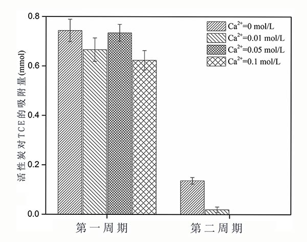 如圖2所示,進行了兩次吸附/再生循環(huán)。在第一次吸附/再生循環(huán)期間,當鈣離子存在時,TCE去除明顯減少。顯然,在第二次吸附/再生循環(huán)期間,即使進行活性炭的再生,也難以在鈣離子條件下除去TCE。這表明鈣離子不僅在活性炭的吸附能力,而且在其再生過程中都起著重要作用。原因可能是由于鈣離子與其他離子的結合,導致其容易在活性炭表面上沉淀并影響其吸附能力,導致第二循環(huán)中TCE去除的減少。