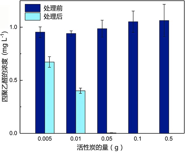圖2顯示了在不調(diào)節(jié)單一體系中的聚乙醛溶液的pH的情況下處理前后的四聚乙醛濃度?梢钥闯觯行У爻チ司垡胰,特別是在活性炭劑量較高的情況下。單因素統(tǒng)計檢驗證實,在活性炭處理2小時之前和之后,乙醛濃度之間存在顯著差異(p<0.05)。當活性炭用量從0.005g增加到0.05g時,去除甲醛的百分比從30.3%增加到99.6%。當PAC用量高于0.05 g時,處理后未檢測到乙醛,表明其濃度低于檢測到的聚乙醛(1~5μgL-1)。