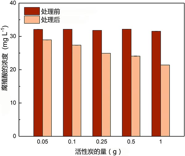 圖3顯示了不同劑量的活性炭處理之前和之后的HA濃度。通過在活性炭上吸附適度除去HA。隨著活性炭劑量的增加,HA的去除百分比范圍為9.8%至32%。雖然處理前HA的初始濃度(C 0=30 mg L-1)遠高于聚乙醛(C 0=1 mg L-1),但高劑量的活性炭(例如1g)在2小時內(nèi)也只能去除32%的HA。