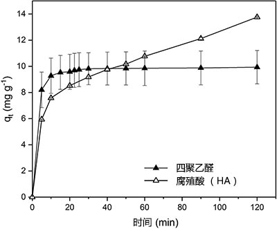 圖4:在單吸附系統(tǒng)中2小時內(nèi)PAC對聚乙醛和HA的吸附比較。