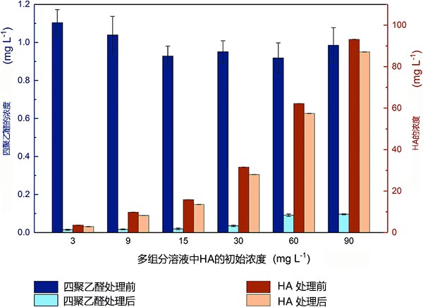 圖5:活性炭處理前后二元吸附系統(tǒng)中的聚乙醛和HA的濃度,不同的初始濃度的HA,而初始的聚乙醛濃度固定為1 mg L-1。