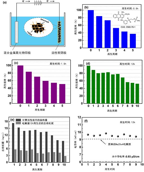 圖1。再生時間對RE和總有機碳(TOC)去除的影響。(a)設置示意圖。(b)-(d)當再生時間分別為0.5小時(b),1.5小時(c)和12小時(d)時,RE的變化。(e)再生12小時后的電解質(zhì)TOC,并計算吸附在活性炭上的RB19的TOC。(f)12小時后電解質(zhì)的電導率超過10次再生。