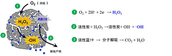 該方法的關鍵特征之一是沒有氧化劑或催化劑外部添加到系統(tǒng)中。過氧化氫電生成和OH生成都發(fā)生在負極化的活性炭上。因此,RB19分子,過氧化氫分子和OH自由基處于相同位置(活性炭的孔隙和表面),這有利于短壽命OH的RB19裂解。擴大此流程的關鍵是活性炭與當前不銹鋼網(wǎng)保持良好可靠的聯(lián)系。這種方法可以將吸附于活性炭內(nèi)的分子去除,再生活性炭的吸附能力,是一種比較好的活性炭再生方法。