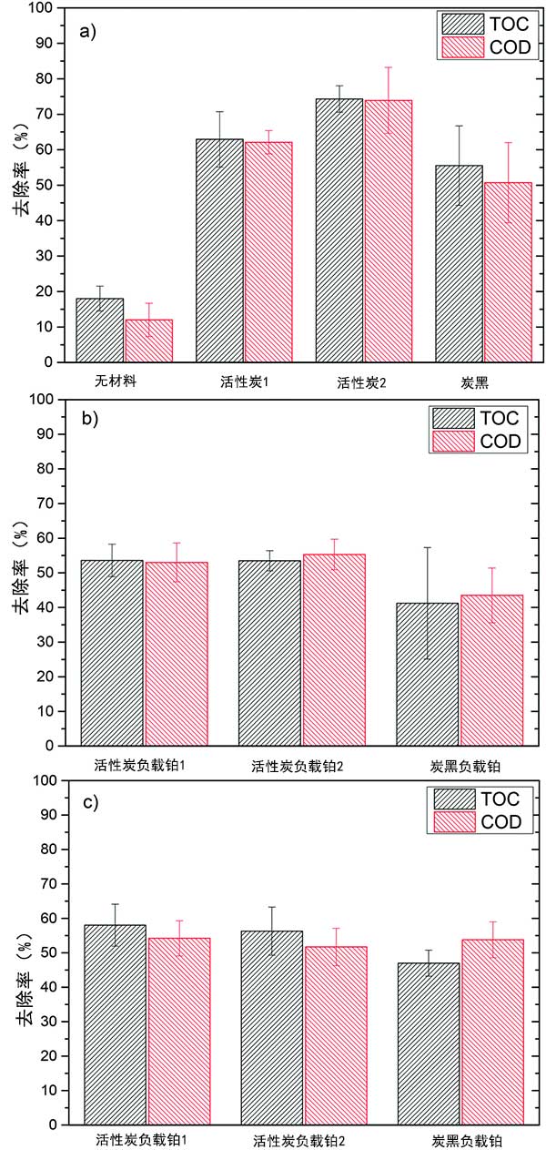 圖1:反應(yīng)4小時后魚罐頭廢水的APR去除TOC和COD,a)批次運(yùn)行中的活性炭與活性炭負(fù)載鉑催化劑b)分批運(yùn)行和c)半連續(xù)運(yùn)行。