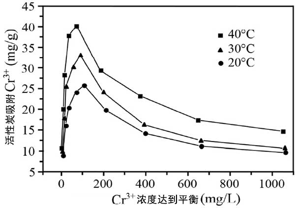 2、已經(jīng)確定,活性炭在20、30和40℃下的鉻吸附等溫線具有取決于平衡濃度的不規(guī)則形狀。三條曲線顯示出類似的趨勢,陽離子攝取量的初始增加非?。達(dá)到最大值后,隨著平衡溶液中鞣劑含量的增加,它們明顯降低。
