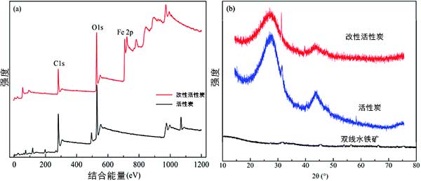 圖2:活性炭和鐵改性的XPS(a)和XRD(b)光譜。
