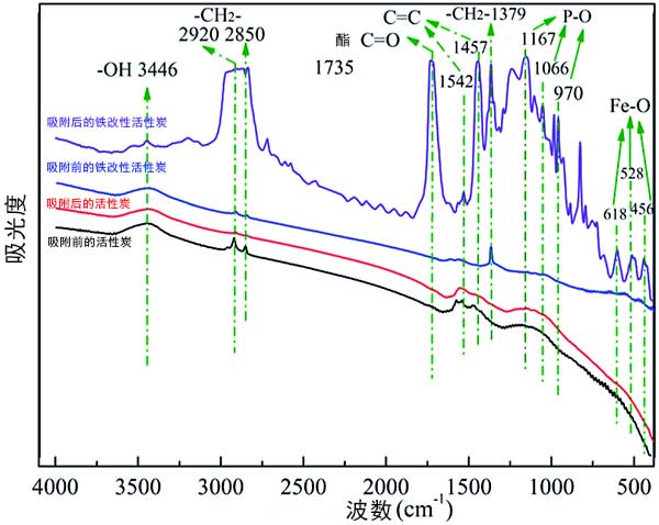 圖3:吸附前后活性炭和鐵改性活性炭的FTIR光譜。